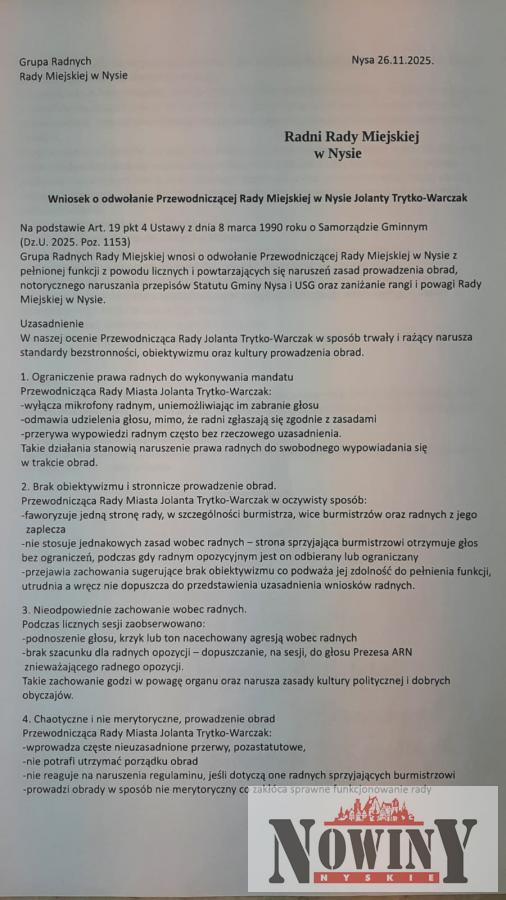 Radni opozycji złożyli wniosek o odwołanie przewodniczącej Rady Miejskiej w Nysie Jolanty Trytko - Warczak z Koalicji Obywatelskiej. Podpisało się pod nim 6 radnych. Uchwała nie była głosowana na sesji, bo przeciw było 12 radnych koalicji. Radna PiS Maria Żukowska - Jacykowska wstrzymała się od głosu, choć pod wnioskiem podpisali się m.in. radni PiS -u.