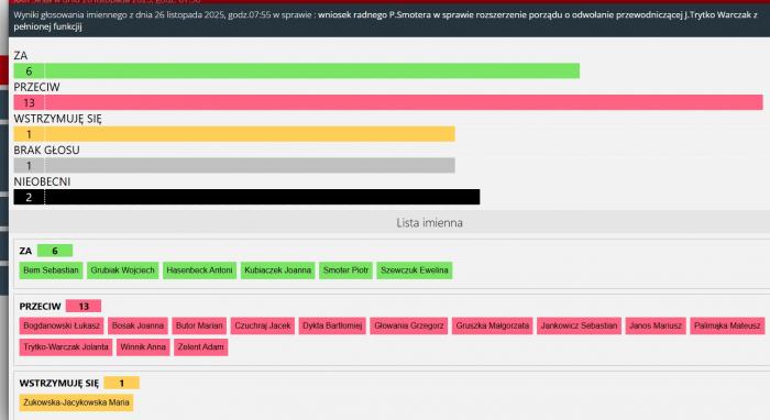 Wniosek o rozszerzenie obrad sesji o głosowanie nad odwołaniem przewodniczącej został odrzucony przez koalicję. Przeciw było 13 radnych koalicji, w tym nie identyfikujących się z koalicją radni Joanna Bosak i Bartłomiej Dykta. Dziwnie zachował się też radna PiS Maria Żukowska - Jacykowska, która wstrzymała się od głosu.