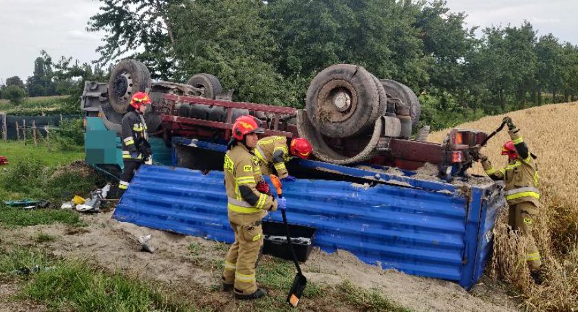 W miniony czwartek 48-letni mężczyzna kierujący tirem marki Mercedes przewoził żwir w okolicach Kopernik. Kierowca jechał zbyt szybko, przez co wjechał do rowu i dachował. Przed przyjazdem służb, samodzielnie opuścił pojazd.