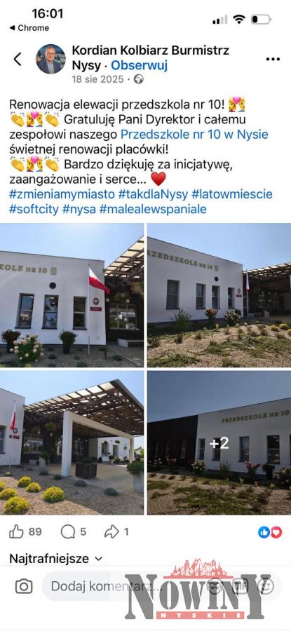 Przedszkole nr 10 w Nysie to chyba rekordzista, jeśli chodzi o „troskę”. Tym razem dyrektor Sylwia Wardakas zatroszczyła się o elewację. Budynek oddany do użytku w 2018 r., a już w latach 2025–2026 elewacja była malowana raz za razem. W ciągu zaledwie roku podpisano co najmniej pięć umów na ten sam budynek i ten sam rodzaj robót.