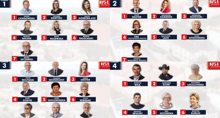 Trzon list stanowią przedstawiciele Stowarzyszenia Samorządowego Liga Nyska. Jedynkami są radni poprzednich kadencji – architekt Piotr Smoter w centrum miasta i Piotr Wojtasik na Południu. Z centrum wystartuje też Danuta Wąsowicz–Hołota, radna czterech kadencji. Listę na Podzamczu otwiera Celina Lichnowska, a tuż za nią jest Jolanta Korytko, właścicielka prywatnego żłobka i była wieloletnia nauczycielka w SP nr 2.