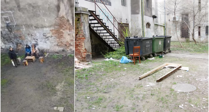 Podwórko to obraz nędzy i rozpaczy, wygląda jakby czas stanął w miejscu. Chyba od końca II wojny światowej nic tam nie robiono. Obdrapane mury i gruntowa nawierzchnia najlepiej o tym świadczą. To nie tylko melina, ale też slums. Jest stara wersalka i stolik z ławeczką, przy którym siedzą „goście” podczas libacji. Właściciel terenu, czyli gmina z jakichś powodów ich nie usuwa, zapewniając warunki do spożywania alkoholu w miejscu publicznym, co przecież jest zakazane.