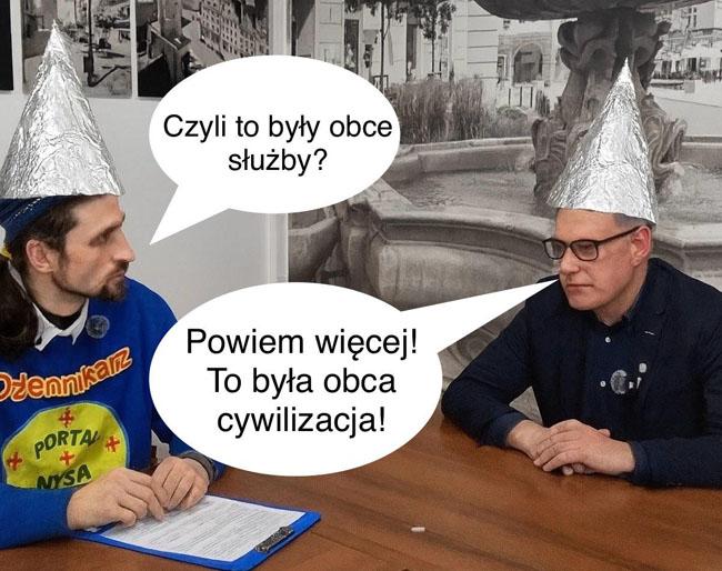 Ucieczka?Pół Polski śmieje się i zastanawia, co burmistrzowi przyszło do głowy mówiąc o ingerencji obcych służb. Czy ma to związek z toczącą się sprawą w prokuraturze? Jak powszechnie wiadomo, jeśli ktoś nie chce odpowiadać za to co zrobił ucieka w niepoczytalność. Zdarza się, że ktoś nie wie, co robi, albo nie jest w stanie ocenić, czy coś jest dobre, czy złe. Wtedy sąd nie może go skazać. Dywagacje te są czysto teoretyczne. |