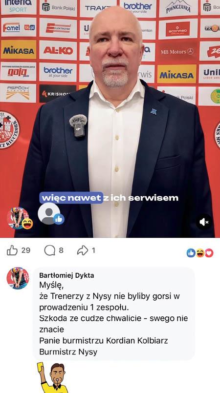 Żółta kartka dla burmistrzaTen pan na zdjęciu, to zagraniczny trener zatrudniony w nyskiej spółce komunalnej Stal. Wyniki osiągane za publiczne pieniądze nie napawają optymizmem. Po ostatniej porażce z drużyną z Kluczborka o komentarz pokusił się radny Bartłomiej Dykta, który pokazał żółtą kartkę burmistrzowi. Wie co mówi, bo sam jest trenerem siatkówki. A my się z nim w pełni zgadzamy, że trenerzy z Nysy nie byliby gorsi w prowadzeniu zespołu Stali. Niestety, komentarz radnego został usunięty.