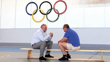 Zdjęcie historyczne. Starosta Daniel Palimąka toczy rozmowę z radnym powiatowym Tomaszem Jazienickim. O czym? Sala gimnastyczna, ławeczka gimnastyczna, a w tle koła olimpijskie. Rozmowa musi być więc o sporcie. |