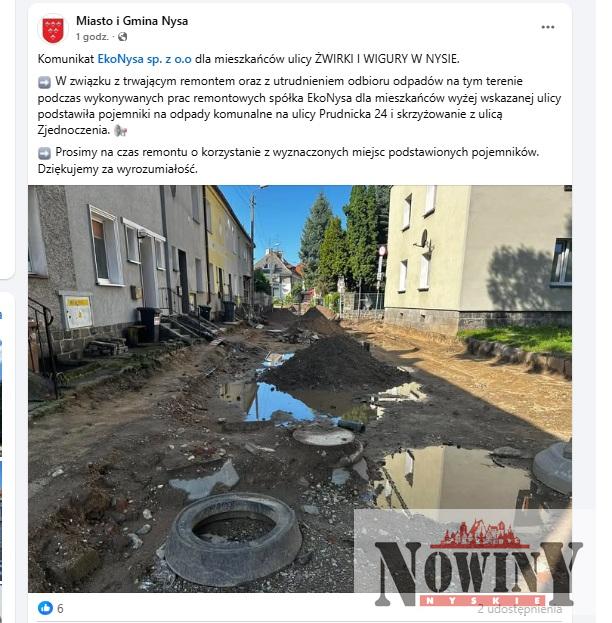 Gmina Nysa tak zorganizowała remont ul. Żwirki i Wigury, że ulica od dłuższego czasu jest nieprzejezdna. W związku z tym, że nic tam nie wjedzie miejska spółka apeluje, żeby mieszkańcy sami nosi śmieci ulicę dalej!