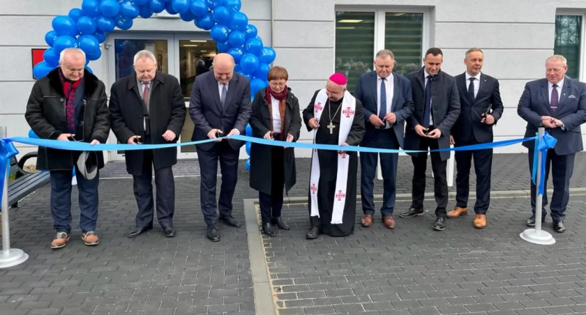 Cztery osoby przecinają wstęgę, a osoba duchowna + cztery czekają na nożyce. Fajne zdjęcie. Szkoda ,że nie ma ( może jest) filmu z tej uroczystości.