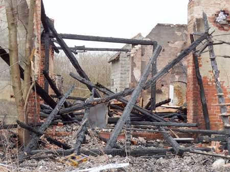 Widok pogorzeliska jest makabryczny. Stodoła i połączona z nią część mieszkalna spłonęły totalnie. W zgliszczach pozostał jedynie sprzęt rolniczy wykonany z metalu. Wszędzie leżą zwęglone krokwie. Z części mieszkalnej budynku również nie pozostało prawie nic. Tu i ówdzie leżą metalowe naczynia, a w kącie to co zostało z pieca.