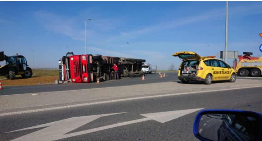 Na miejscu jest policja, która kieruje ruchem. Jak dowiedzieliśmy się nieoficjalnie, przyczyną zdarzenia mógł być… nietrzeźwy kierowca. Przewrócony samochód ciężarowy utrudnia przejazd. Służba drogowa podnosi pojazd.