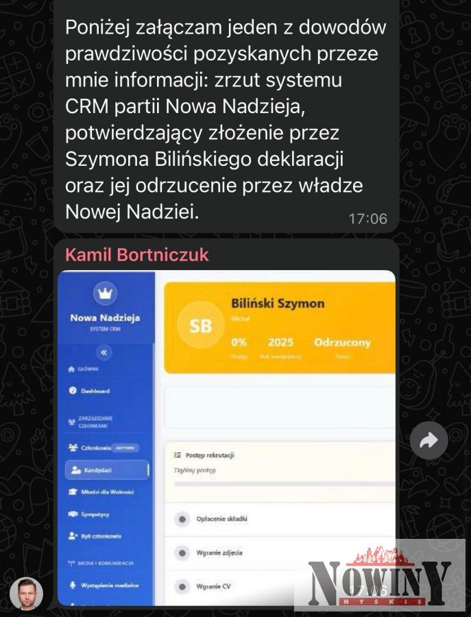 „Otrzymałem informację, a w ślad za nią także dowody, że Szymon Biliński w sierpniu ubiegłego roku, złożył deklarację członkowską do partii „Nowa Nadzieja Sławomira Mentzena” - napisał na partyjnym forum. Do tego opłacić miał składki, ale jego wniosek został odrzucony. Jego zdaniem o wszystkim wiedział Artur Kamiński.