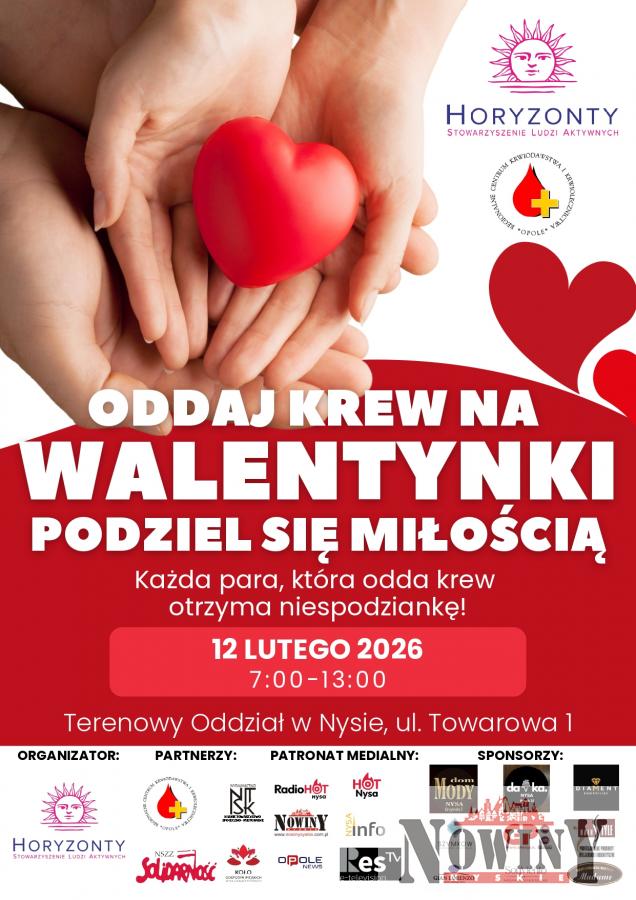 Już w najbliższy czwartek, 12 lutego, w Nysie odbędzie się walentynkowa zbiórka krwi, organizowana przez Stowarzyszenie Ludzi Aktywnych HORYZONTY we współpracy z Regionalne Centrum Krwiodawstwa i Krwiolecznictwa w Opolu. Tegoroczna edycja ma wymiar szczególny — to jubileuszowy, 20. raz wydarzenia w Opolu, a po raz trzeci akcja odbywa się również w Nysie.