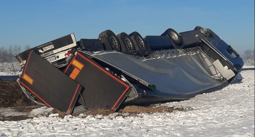 Do wypadku doszło tuż po 7 rano. Ciężarówka na prostej drodze wypadłą z jedni i przewróciła się na bok. Kierowca prawdopodobnie nie dostosował prędkości do warunków na drodze. Na szczęście nikomu nic się nie stało.
