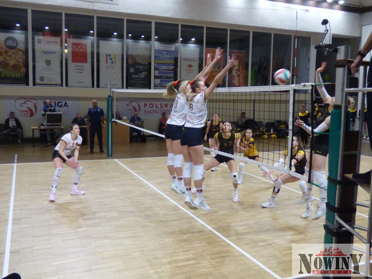 NTSK PANS Komunalnik Nysa - KSG Warszawa 0:3. Podwójny blok nyskiej drużyny w wykonaniu Oliwii Jaroń (numer 8) i Nikoli Witkowskiej. W asekuracji Maja Kaczmarczyk