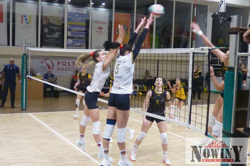 NTSK PANS Komunalnik Nysa - KSG Warszawa 0:3. Podwójny blok nyskiej drużyny w wykonaniu Justyny Zych (numer 5) i Nikoli Witkowskiej