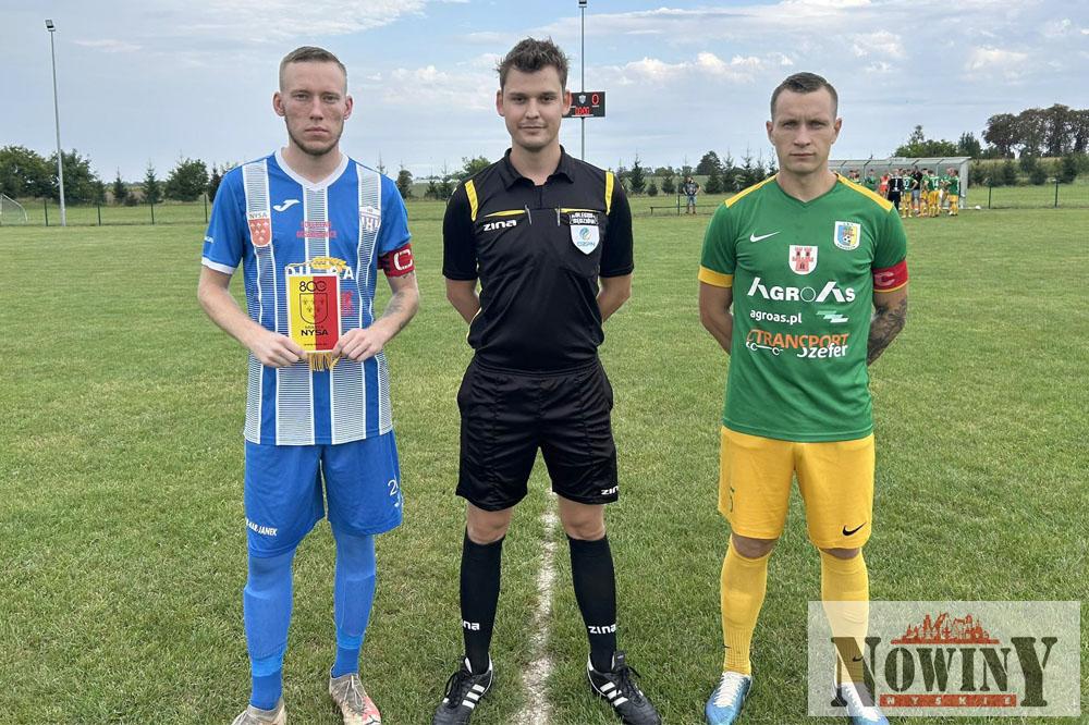 Sędzia Krzysztof Wójcik (w środu) i kapitanowie obu zespołów - Bartłomiej Zabłocki (z lewej) i Dariusz Kubiak