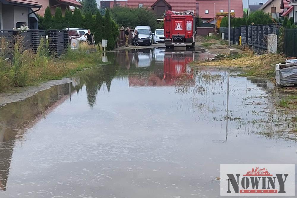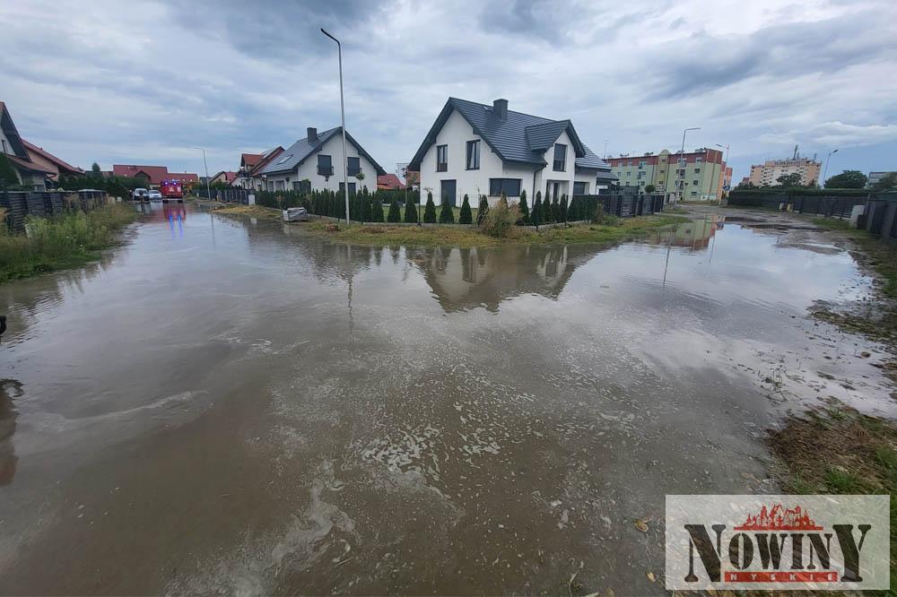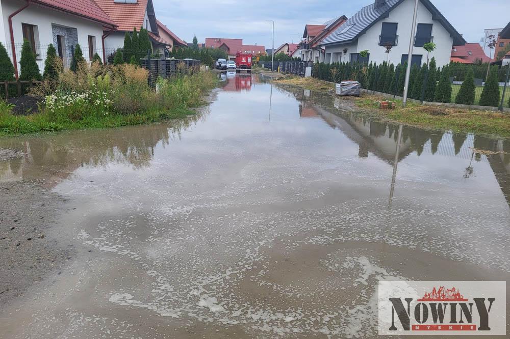 Zdjęcia przedstawiające problem z brakiem infrastruktury na osiedlu domów jednorodzinnych przy ulicy 17 Września w Nysie. Można zobaczyć zalane błotem ulice, samochody próbujące się przedostać przez kałuże oraz prace nad budową nowej drogi. Brakująca kanalizacja deszczowa sprawia poważne problemy mieszkańcom.