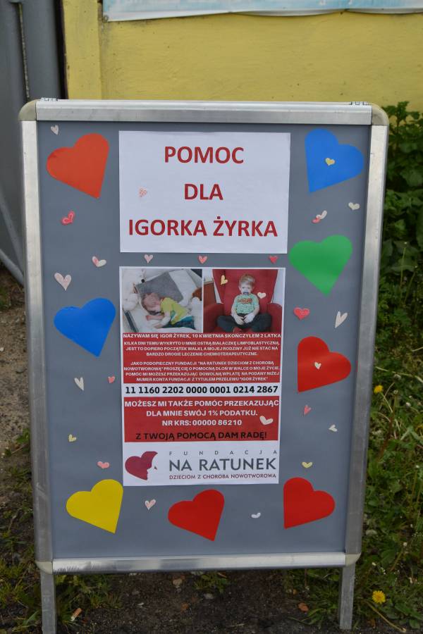W sobotę, 4 maja na stadionie miejskim w Paczkowie odbył się festyn charytatywny dla dwuletniego Igora Żyrka chorego na ostrą białaczkę limfoblastyczną. Rodzice Igora w kwietniu dowiedzieli się, że ich syn jest chory na białaczkę. Leczenie chemioterapeutyczne chłopca jest bardzo kosztowne. Dlatego mieszkańcy Paczkowa postanowili wesprzeć rodzinę w walce o życie dziecka. W pomoc zaangażowało się wiele osób prywatnych i instytucji. Organizowane były i nadal są zbiórki na ten cel. W minioną sobotę odbył się festyn, podczas którego wolontariusze zbierali cegiełki na rzecz dwulatka.