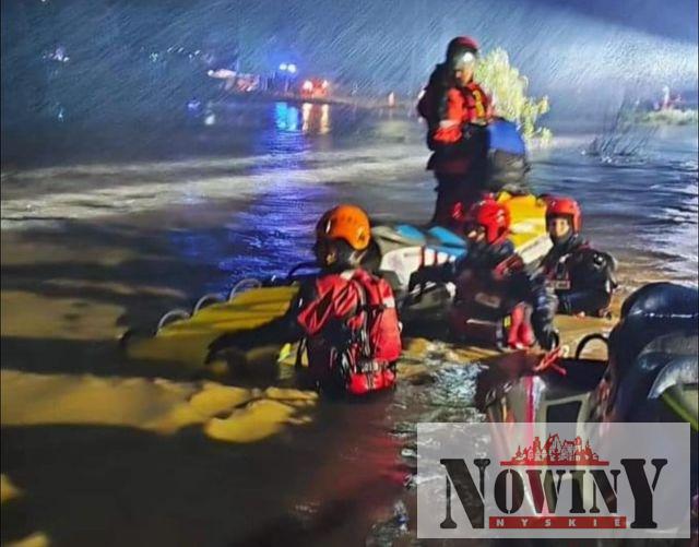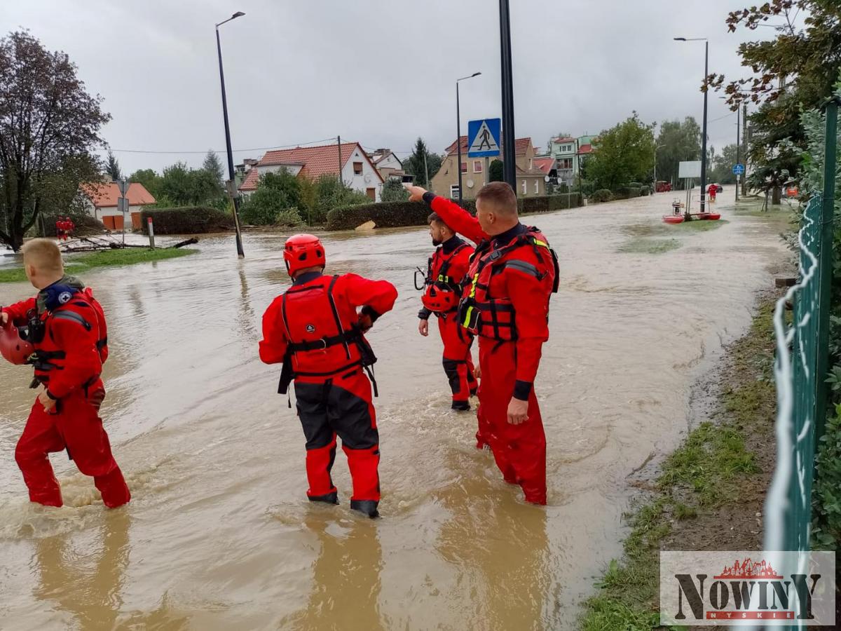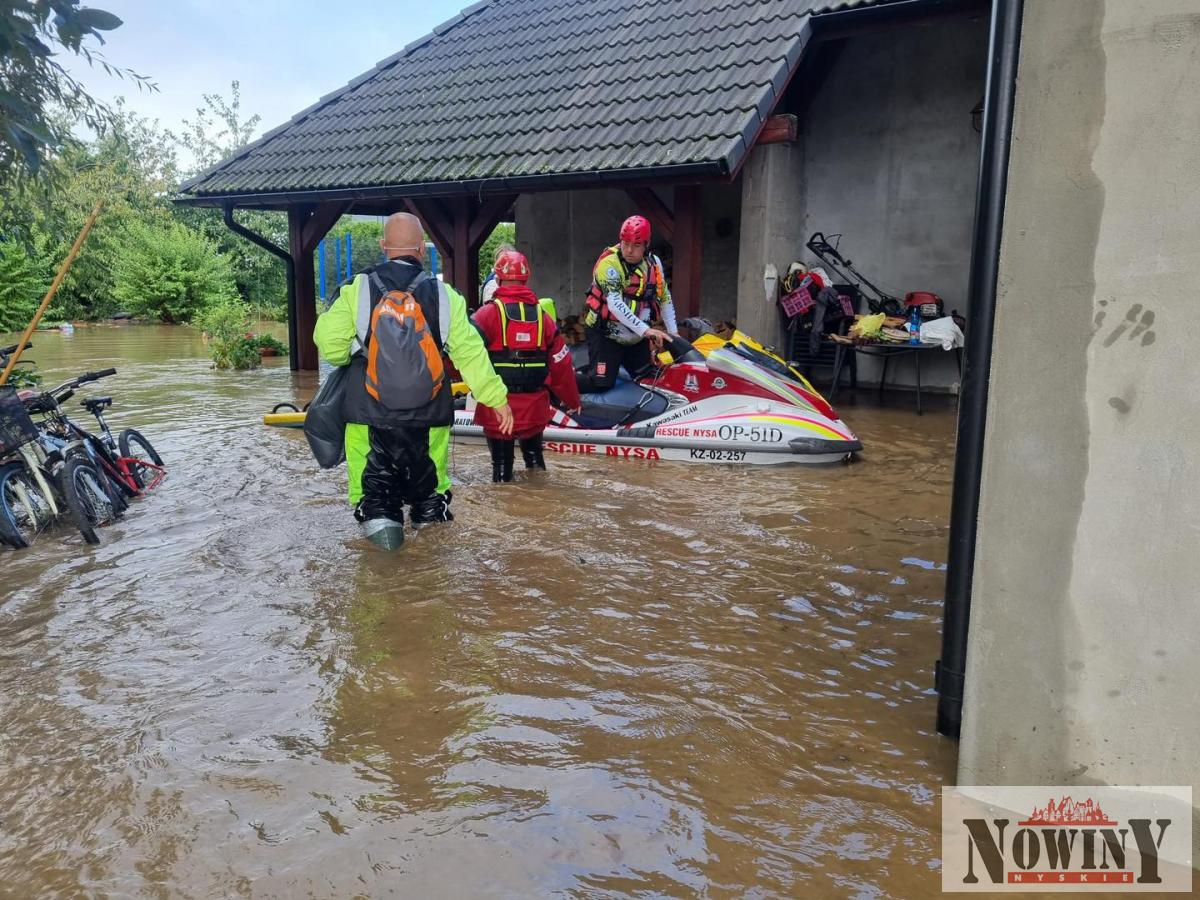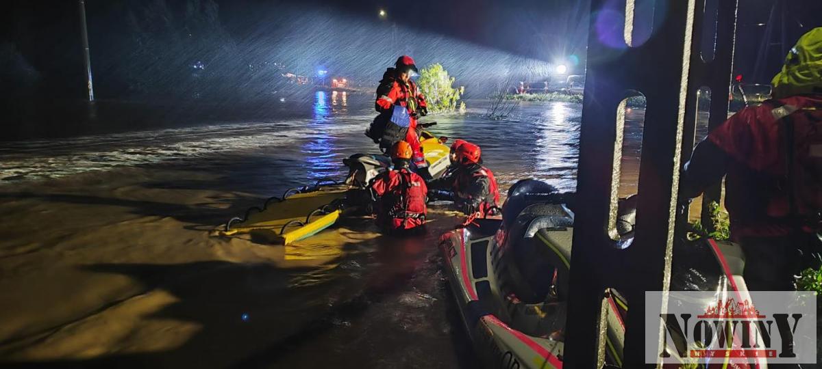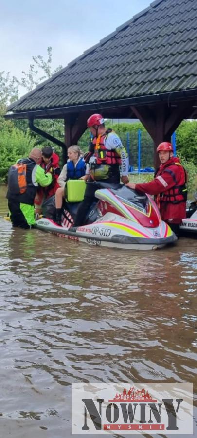 Galeria zdjęć przedstawiająca dramatyczne akcje ratunkowe nyskich woprowców podczas powodzi. Zdjęcia ukazują ratowanie uwięzionej rodziny w pojeździe otoczonym przez wodę, trudności z silnikiem skutera wodnego, ewakuację mieszkańców z zalanych ulic oraz zaangażowanie ratowników w bezpośrednią walkę z niszczycielskimi skutkami katastrofy. W tle widać łodzie ratunkowe, zalaną infrastrukturę miejską i groźne warunki atmosferyczne. Pokazują odwagę, determinację i poświęcenie ratowników oraz solidarność wobec poszkodowanych.