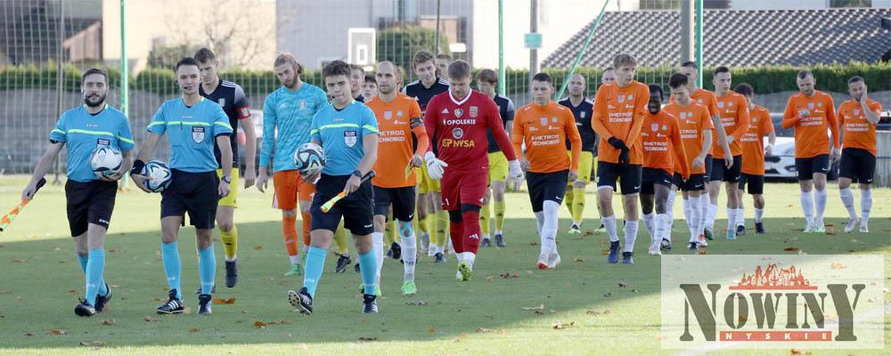 LZS Domaszkowice - MKS Gogolin 0:0. Sędziowie wyprowadzają drużyny LZS Domaszkowice i MKS Gogolin na boisko